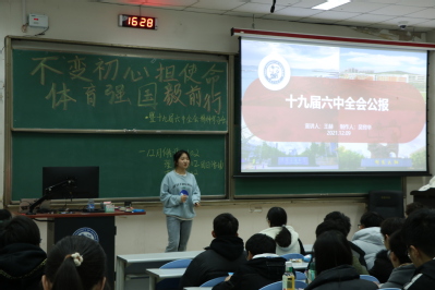 随后,同学们来到西环107,首先,全体同学起立齐唱团歌,重温入团誓词,重温入团时刻。接着,四个班级的团支书组织同学们观看了关于十九届六中全会的视频,并对十九届六中全会精神进行了进一步解读,解释了何为“两个确立”,并组织大家学习“习近平新时代中国特色社会主义思想”内容,了解习近平新时代中国特色社会主义思想意义和影响和党的百年奋斗的“十个坚持”内容。最后,由主持人总结此次活动,呼吁各团支部成员不忘初心担使命,争做新时代奋进者、开拓者、奉献者。