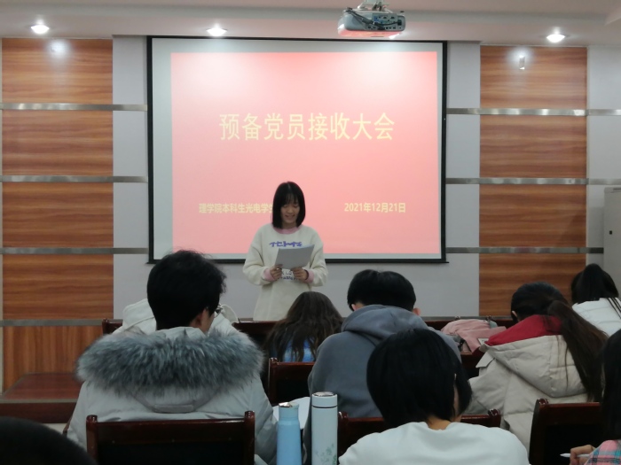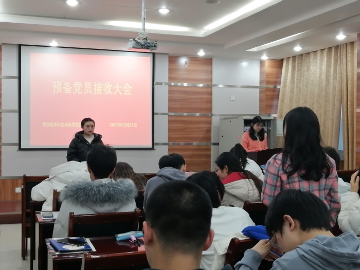 2021年12月21日下午16:00-17:50,SUNBET申博光电党支部全体成员在文理楼254开展光电党支部预备党员接收大会暨12月生活组织会。预备党员接收大会出席人员27人,正式党员11名,会议应到27人、实到27人。由乔良欣主持会议,严格按照组织程序进行。