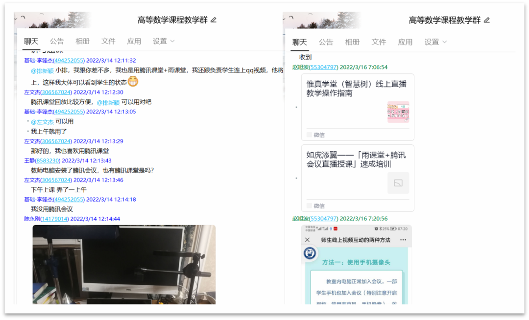 教学过程中,老师们群里分享、交流线上教学经验,不断学习、研发 “新技能”,为提高线上教学质量保驾护航。