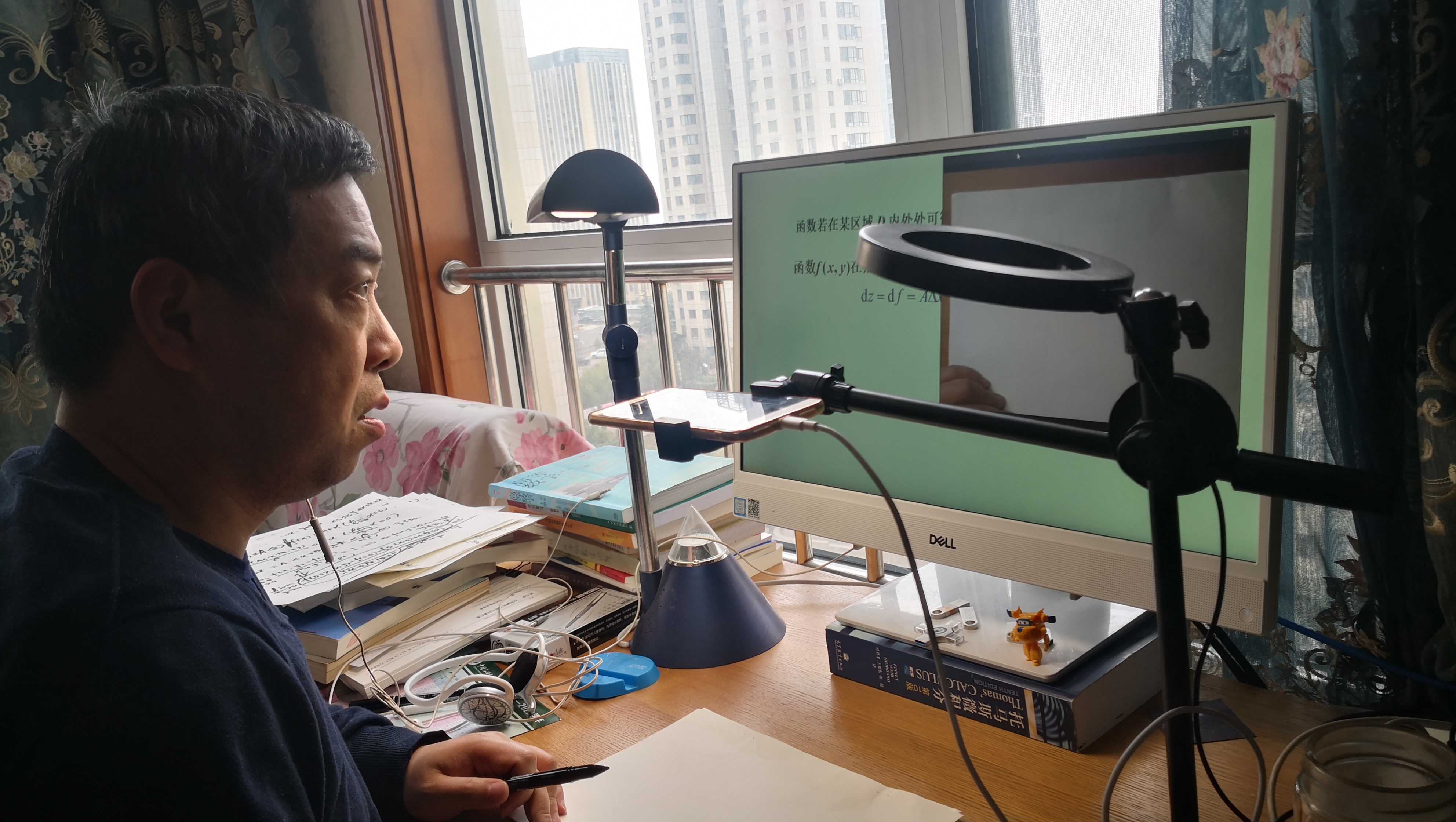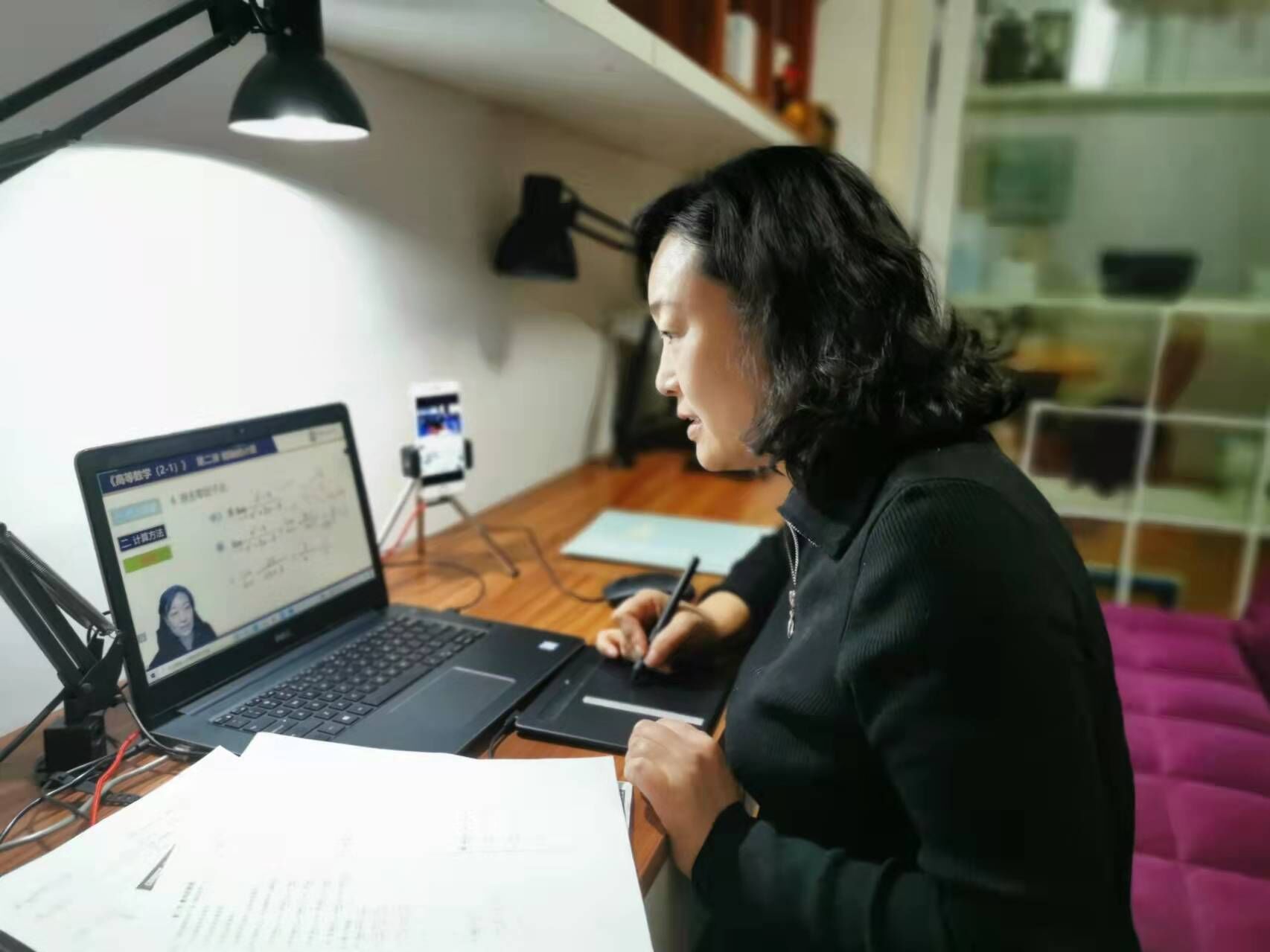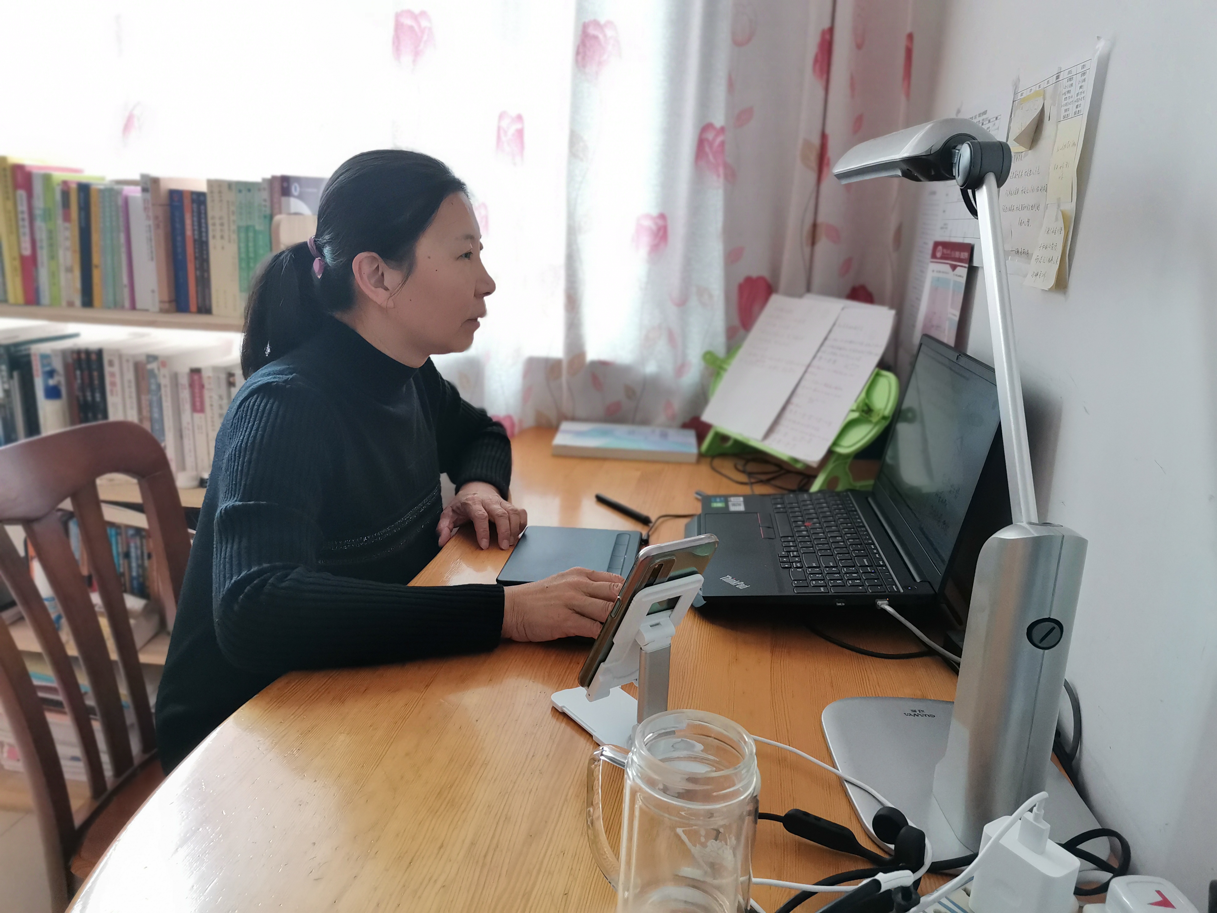 通过提前建立答疑小组、建立共享文档、及时与课代表交流、与同事分享经验等措施保障了课程的顺利推进,提高同学入镜率的手机支架、增加理论可视性的手写板等各种新型“武器”层出不穷。