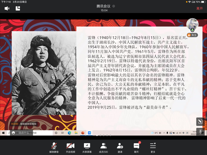 朱玉同学首先向参会人员介绍了雷锋同志的相关事迹以及其精神内涵。随后,为了巩固同学们对雷锋同志及雷锋精神的认知,刘羽菲同学针对此次团日活动的主题相关内容进行了提问,同学们通过弹幕方式积极发言,讲述自己的理解。彭尉伦同学更是语音连麦回答了问题,在他看来,雷锋精神的基本内涵即是无私奉献的伟大精神。