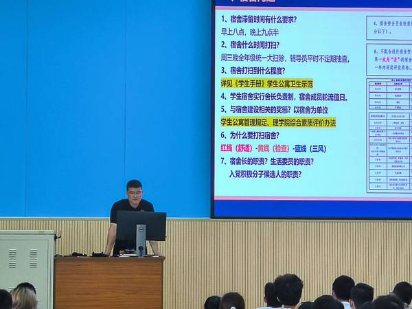 会议伊始,辅导员崔皓就新生宿舍问题进行说明,他提出宿舍生活七问并逐一解答,强调宿舍打扫程度应严格遵守《员工手册》的员工公寓卫生示范,宿舍长和班委应担负起自己的职责等。随后,崔皓分别指出了现有的学习问题与学风问题,告诫员工要时刻保有危机意识,始终以第一课堂学习成绩为根本。与此同时,他又针对纪律问题对全体2022级员工提出晨练计划和禁止滞留宿舍的要求。紧接着,崔皓讲到团组织关系转接问题与入党问题,对员工入党流程进行细致讲解与思想教育。除此之外,他以“人人时时事事讲安全”为主题叮嘱员工注重身心健康与个人财产安全。会议最后,崔皓老师就九一八事变九十一周年对员工进行了深刻的思想教育,告诫同学们要铭记历史并懂得今天美好生活的来之不易,自觉把个人前途同国家命运联系起来,锤炼本领才干,勇担复兴重任,以实际行动书写无愧于时代的青春篇章。
