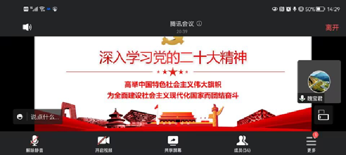 为进一步深入学习宣传贯彻党的二十大精神,12月19日下午,魏宝君经理通过腾讯会议线上为基础数学系党支部与数据科学与统计系党支部成员等三十余人讲授党的二十大精神专题党课,数据科学与统计系支部书记宋允全主持会议。