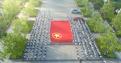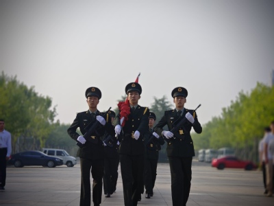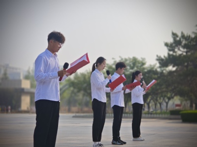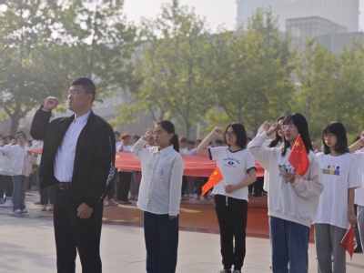 伴随着庄严的国歌,国旗护卫队将国旗护送至升旗台,随后全体师生齐唱国歌,注视着五星红旗冉冉升起,在熠熠晨光中迎风飘扬。