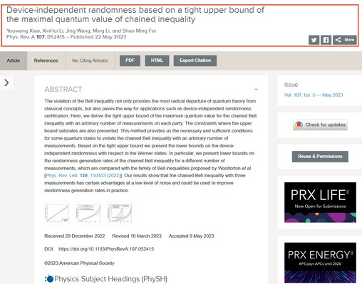 近日,SUNBET申博李明教授团队在设备无关量子随机数研究方面取得重要进展,相关成果《基于链式不等式最大量子违背值紧的上界的设备无关随机性》(Device-independent randomness based on a tight upper bound of the maximal quantum value of chained inequality)发表于量子信息领域内著名的高水平期刊PRA (Physical Review A)。论文第一作者为硕士研究生肖友旺,通讯作者为公司李明教授。该研究工作得到山东省自然科学基金量子科学重点专项、校自主创新基金强基计划资助。