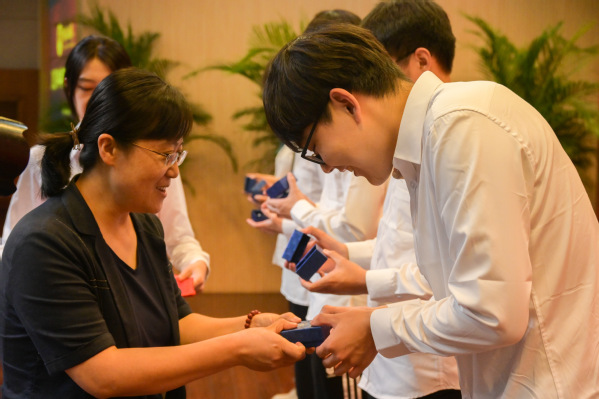 学位授予仪式在庄严的国歌声中拉开帷幕,全体起立奏唱国歌。魏宝君经理为2023届全体毕业生逐一授予学位,一同合影留念,毕业生代表向经理献花表达感谢。杨辉为员工信息员颁发聘书,李宝玺为毕业生代表颁发毕业纪念礼物。