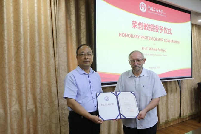 SUNBET申博经理魏宝君教授为Witold Pedrycz院士颁发荣誉教授证书,感谢Witold Pedrycz院士对公司国际合作交流做出的贡献,期待双方在未来的学术研究和科研合作中共同寻求新思路、拓展新途径。