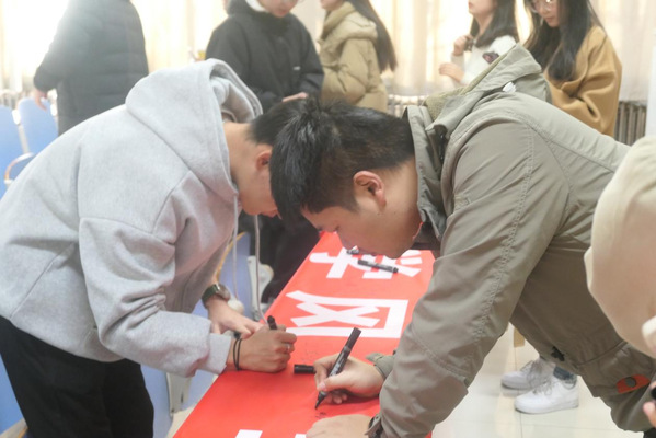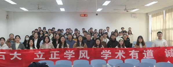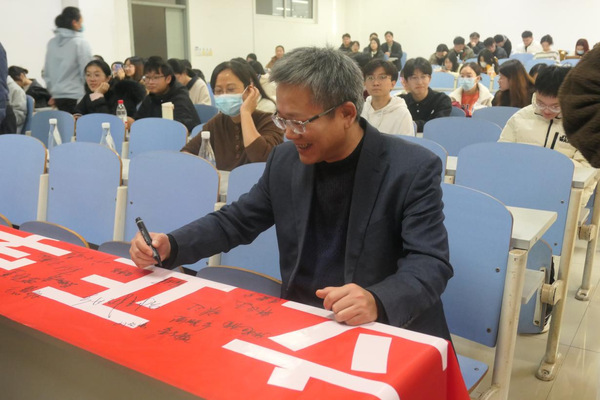 纪晓琦带领全体师生庄严宣誓,恪守学术道德,弘扬学术诚信;维护学术尊严,抵制学术不端;做高尚学术道德的践行者,做优良学术风气的引领者。宣誓结束后,全体师生依次在横幅上写下自己的名字,承诺将在今后的学术研究和学术道德活动中坚守学术诚信,严守道德规范。