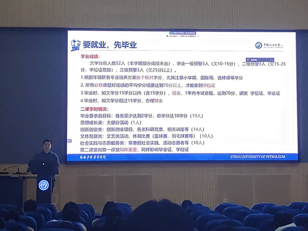 会上,高旭从宿舍安全卫生、心理健康、交通安全、提高防火意识等多个方面展开讲解。他特别强调了网络安全问题,提醒同学们要警惕网络诈骗和保护个人信息。针对就业推进工作,高旭对2020级本科生就业情况进行了总结分析,指出了当前就业形势的严峻性和就业准备的重要性。他鼓励同学们要树立正确的就业观念,提前规划自己的职业发展。