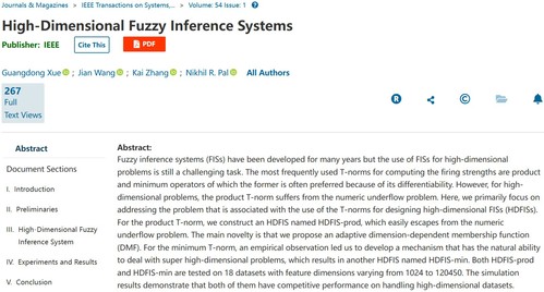 论文“High-Dimensional Fuzzy Inference Systems”(高维模糊系统)发表在《IEEE Transactions on Systems, Man, and Cybernetics: Systems》,论文第一作者为2019级博士生薛广东,通讯作者为王健教授、Nikhil R. Pal教授。为基于标准T范数设计高维模糊系统,作者在两种被广泛使用的乘积T范数与取小T范数基础上分别设计高维模糊系统,提出了一种与特征维度相关联的隶属度函数和设计了特定的优化策略,在理论上完全符合模糊逻辑推理的理论基础,在数值实验上其性能可以媲美自适应TSK模糊系统等模型,该工作完善了高维模糊系统的模型设计,为后续研究基于标准T范数的高维模糊系统提供了研究思路。