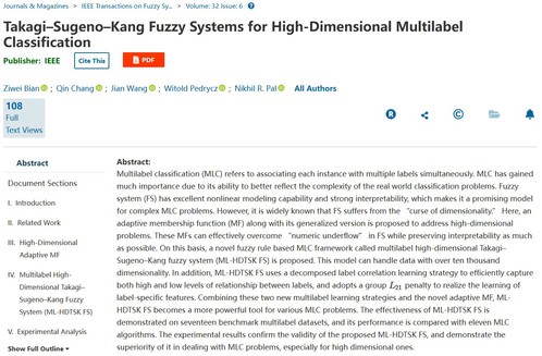 论文“Takagi–Sugeno–Kang Fuzzy Systems for High-Dimensional Multilabel Classification”(多标签Takagi–Sugeno–Kang模糊系统分类研究)发表在《IEEE Transactions on Fuzzy Systems》,论文第一作者为2021级硕士生边紫薇,通讯作者为常秦老师。作者针对TSK模糊系统的高维诅咒及多标签分类问题输出空间庞大等问题进行创新,设计了另一种自适应隶属度函数(High-Dimensional Adaptive Membership Function, HDAMF),其可以根据数据维度变化动态调整隶属度函数宽度,以避免模型发生数值下溢,该工作将高维TSK模糊系统的应用场景由单标签分类问题拓展到多标签分类领域,利用模糊推理来解决标签之间的关联性和不确定性,为模糊系统在多标签分类领域的研究提供新思路。