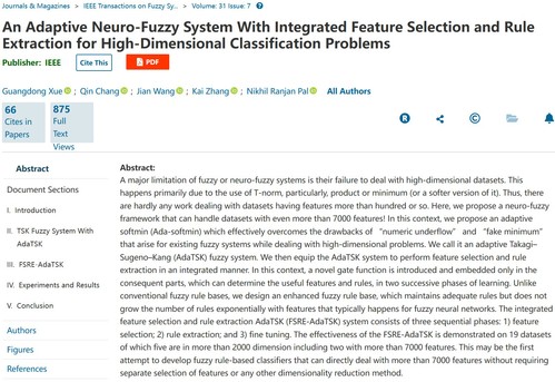 论文“An Adaptive Neuro-Fuzzy System With Integrated Feature Selection and Rule Extraction for High-Dimensional Classification Problems”(融合特征选择与规则提取的自适应神经模糊系统求解高维分类问题)发表在《IEEE Transactions on Fuzzy Systems》,论文第一作者为2019级博士生薛广东,通讯作者为王健教授。作者在取小T范数上进行设计,提出了软取小算子的自适应形式,进而提出了自适应TSK(Adaptive Takagi-Sugeno-Kang,AdaTSK)模糊系统,自适应软取小算子解决了传统软取小算子易出现数值溢出与伪取小的问题,使得自适应TSK模糊系统成功用于高维问题的处理,该工作对高维数据上的模糊系统建模给出了新的思路,扩展了模糊系统的应用场景。