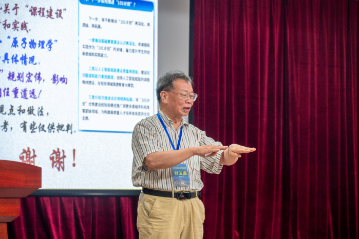 中国物理学会物理教学委员会秘书长、教育部物理学类专业教学指导委员会副主任委员、北京大学博雅特聘教授刘玉鑫受邀做大会报告,介绍“101计划”背景下原子物理学课程建设的思考与实践情况,指出课程目标必须定位到:既立德树人,又启迪智慧,培养并提高同学们的科学品质和创新能力。教材建设要保证实现课程理念和目标;依据认知规律和学科范畴的系统性和结构性组织基本内容,依据学科前沿动态与社会发展需求更新课程内容。