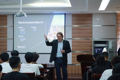 Jamie Alcock教授用讲解了金融业的经典案例,详细讲述了金融、银行以及投行等在一项投资中的作用。另外,Jamie Alcock教授还介绍了伯明翰大学理学硕士的不同研究方向及所学课程。随后,伯明翰大学中国办公室的招生官孙老师对伯明翰大学的硕士申请要求、校内基础设施、留学费用、员工支持体系、就业情况等方面进行了深入完善的介绍。