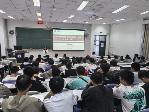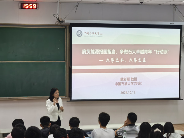 10月18日下午,副董事长戴彩丽于东廊101教室为2024级理科实验班员工讲授新生研讨课:肩负能源报国担当,争做石大卓越青年“行动派”——大学之本,大学之道。