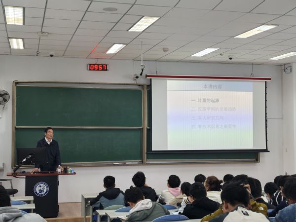 课上,于连栋围绕“计量的起源”,用《说文解字》中的记录来阐释“仪,度也”“器,皿也”,并指出计量是现代工业的源动力,点明专业与学科的关系和学科定位,提到近代重大自然科学革命都起源于在测量实验过程中的发现和实验的验证。围绕学科发展趋势,于连栋指出几何测量尺度和条件的极大扩展,智能传感及网络化测量。围绕个人研究情况,于连栋介绍了他的研究领域和近五年来主持的科研项目,着重讲解了“超快激光精密测试及加工技术”、“微纳传感与微流控技术”和“3D宏观尺寸坐标测量技术”的研究背景和内容。于连栋在学风建设方面提出思考,指出要“实干兴邦”“实干旺院”“实干梦成”。