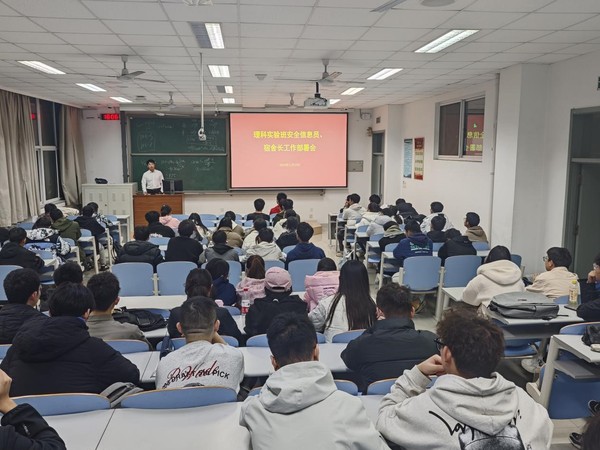 11月25日晚,理科实验班于南教218召开安全信息员、宿舍长工作部署会,会议由辅导员刘威主持,兼职辅导员董朝阳及理科实验班全体安全信息员、宿舍长参加会议。