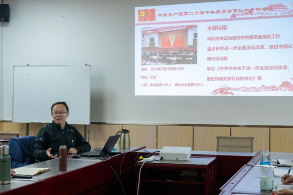 12月19日下午,物理实验中心党支部与理科实验班员工党支部联合开展“学原文找原点,寻初心践使命-从二十届三中全会看伟大建党精神”党课,本次党课邀请了山东省优秀党务工作者、石油工程公司教授贾寒担任主讲人,共计30余名党员参加党课。