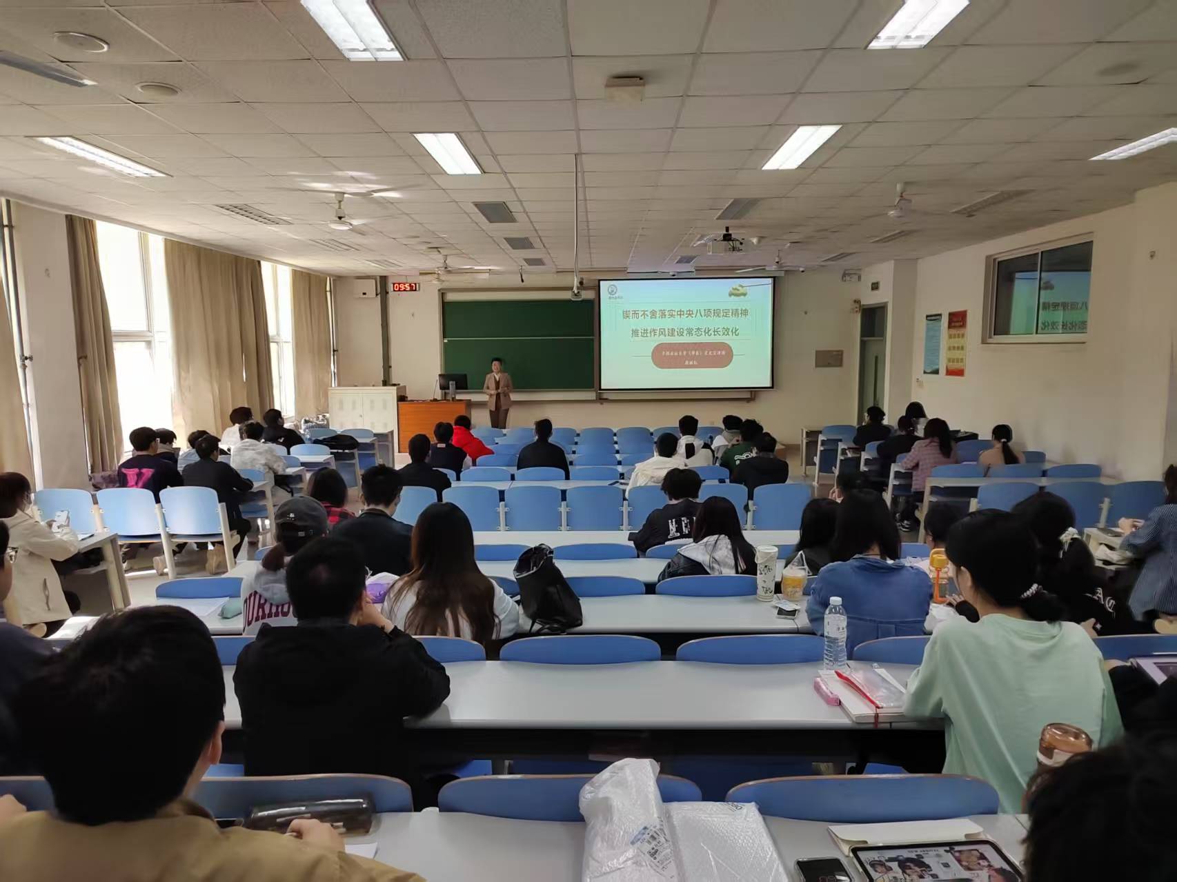 讲座从中央八项规定的制定实施和破题深化、领会中央八项规定的精神内核和如何贯彻中央八项规定精神三个方面逐次展开,原丽红老师以老员工的成长困惑引出中国共产党在发展过程中面临的风险挑战,通过生动的阐释让全体同学领会到中央八项规定是盘活党的作风建设整盘棋的“关键子”,老员工要从自身做起,树立正确的价值观,奉行廉洁自律,共同营造风清气正的社会氛围。