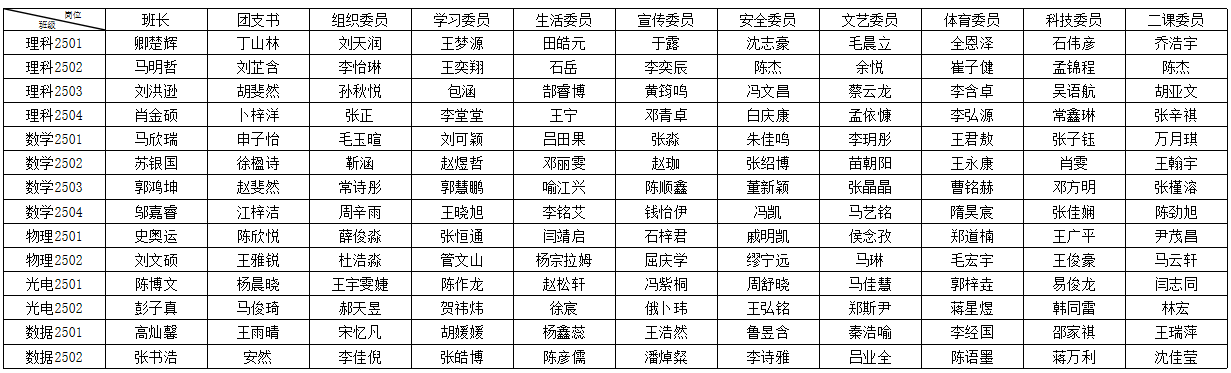 为推进SUNBET申博2025级员工干部队伍建设,做好2025级员工的教育与管理工作,培育提升员工的综合素质和工作能力,保证2025级各班级员工工作的顺利开展,经过员工个人申请与答辩、班级民主选举以及班主任、辅导员与学长领航员集中酝酿,现将SUNBET申博2025级班干部竞选结果公示如下: