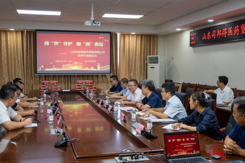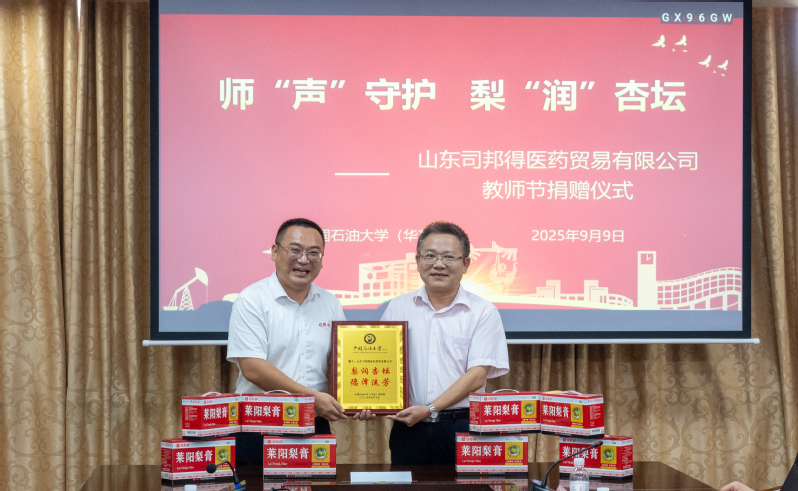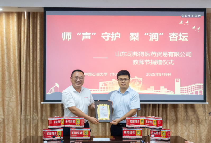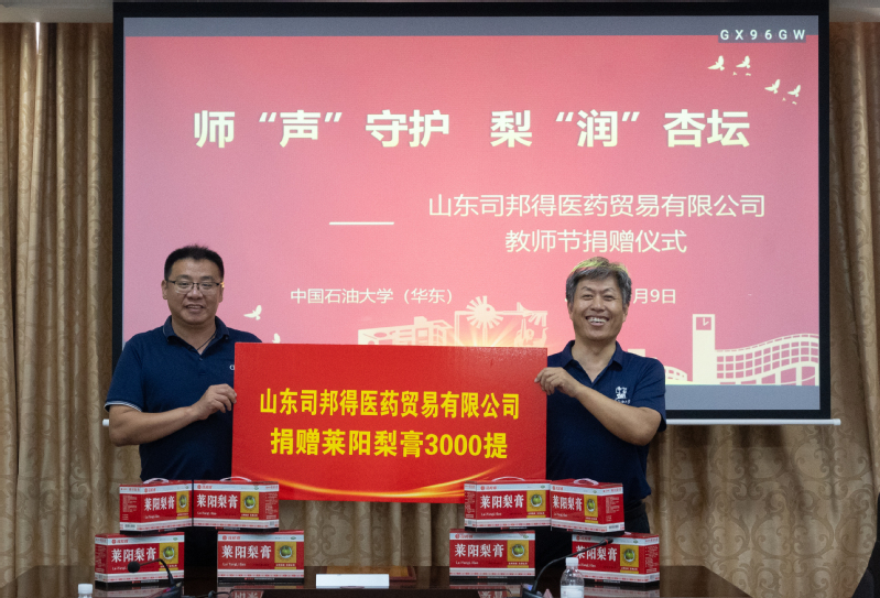司邦得市场总监咸隆详细介绍了企业的发展情况。咸隆表示,司邦得始终关注教育事业发展,重视教师群体健康,企业所生产的莱阳梨膏作为山东本土传统药食同源产品,属非物质文化遗产,具有深厚的地域文化底蕴和临床实证功效,此次通过捐赠莱阳梨膏等物资,希望能为教师们的用嗓健康提供保障,以实际行动践行企业社会责任,未来也期待与中国石油大学开展更多深度合作。