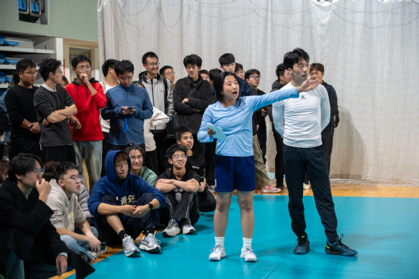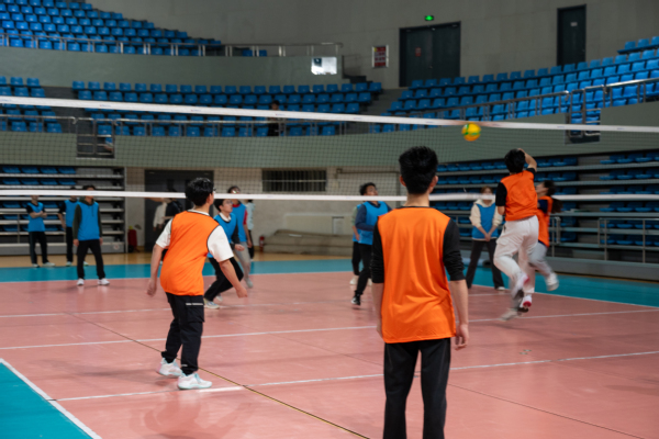 赛前,刘威讲解排球发球、得分、判罚等基本规则及安全注意事项,排球队成员则进行垫球、传球、扣杀等基础动作示范,仔细纠正姿势偏差,帮助零基础新生快速掌握入门技巧。随后两场热身赛让新生们在实战中熟悉规则、磨合默契,为正式比赛蓄力。